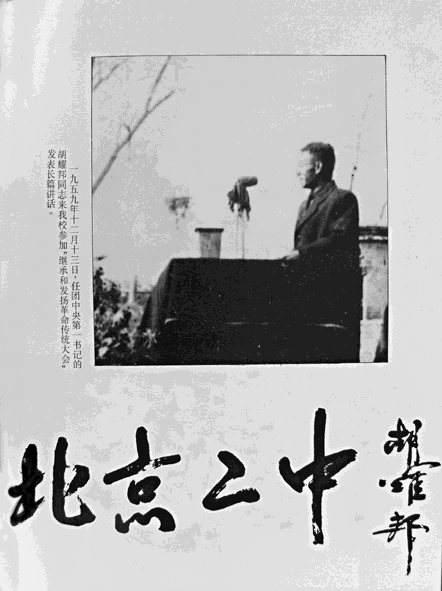 1959年12月13日,由于我校学生胡德平的关系,校方请到了其父,时任团中央第一书记的胡耀邦来给全校师生作革命传统教育的报告。(胡耀邦演讲和题字的照片见左) 这对我们中学来说,算是一个很隆重的活动了。
